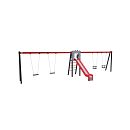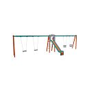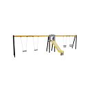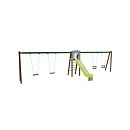 Certifikovaná bezúdržbová veža v tvare A s rebrinovým výlezom a šmykľavkou, doplnená dvoma visiacimi hojdačkami. Na jednej strane sú dva klasické sedáky, na druhej strane dva baby sedáky. Baby sedák pre dieťa obsahuje ohrádku s priečkou medzi nohami dieťaťa, ktorá zabraňuje zosunutiu alebo spadnutiu počas hojdania. Zároveň sa môže oprieť. Oceľová konštrukcia je odolná voči poveternostným vplyvom vďaka zinkovaniu a lakovaniu odolnou práškovou farbou. Použitý HPL materiál a HDPE plast je chemicky odolný, odolný voči UV žiareniu - stálofarebný, netoxický, recyklovateľný a nelámavý. Nehrozí tak poranenie detí ostrými hranami alebo úlomkami. Všetky spoje sú nerezové a zakryté plastovými krytkami pre zvýšenie životnosti a bezpečnosti.