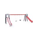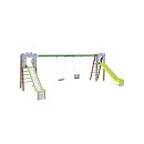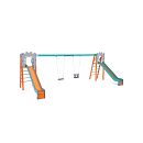 Dve certifikované bezúdržbové veže v tvare A s rebrinovým výlezom a šmykľavkou, doplnená dvoma visiacimi hojdačkami. Môžete si vybrať klasický sedák, baby sedák alebo ich kombináciu. Baby sedák obsahuje ohrádku s priečkou medzi nohami dieťaťa, ktorá zabraňuje zosunutiu alebo spadnutiu dieťaťa. Zároveň sa dieťa môže oprieť. Oceľová konštrukcia je odolná voči poveternostným vplyvom vďaka zinkovaniu a lakovaniu odolnou práškovou farbou. Použitý HPL materiál a HDPE plast je chemicky odolný, odolný voči UV žiareniu - stálofarebný, netoxický, recyklovateľný a nelámavý. Nehrozí tak poranenie detí ostrými hranami alebo úlomkami.