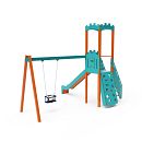 Jednovežová kombinovaná zostava - veža s hradbami, na ktorú deti vylezú po schodíkoch alebo po lezeckej stene s úchytmi a dolu sa môžu spustiť po šmýkalke. Súčasťou hernej zostavy je rahno hojdačky so sedákom Klasik alebo Baby. Tyrkysovo-oranžový dizajn už z diaľky láka ku hre. Oceľová konštrukcia je odolná voči poveternostným vplyvom vďaka žiarovému zinkovaniu a lakovaniu odolnou práškovou farbou. Použitý HPL materiál je chemicky odolný, odolný voči UV žiareniu - stálofarebný, netoxický, recyklovateľný a nelámavý. Nehrozí tak poranenie detí ostrými hranami alebo úlomkami. Všetky spoje sú nerezové a zakryté plastovými krytkami pre zvýšenie životnosti a bezpečnosti.