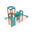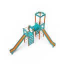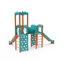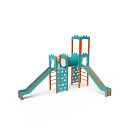 Dvojvežová kombinovaná zostava - jedna veža s hradbami, druhá nízka sú prepojené tunelom. Na zostavu deti vylezú po lezeckej stene s úchytmi, po rebríku, po schodíkoch alebo oblúkovej lanovej sieti a dolu sa môžu spustiť po jednej z dvoch šmýkaliek. Tyrkysovo-oranžový dizajn už z diaľky láka ku hre. Oceľová konštrukcia je odolná voči
