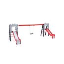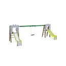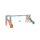 Dve certifikované bezúdržbové veže v tvare A s rebrinovým výlezom a šmykľavkou, doplnená visiacou hojdačkou. Môžete si vybrať klasický alebo baby sedák. Baby sedák obsahuje ohrádku s priečkou medzi nohami dieťaťa, ktorá zabraňuje zosunutiu alebo padnutiu. Zároveň sa môže oprieť. Oceľová konštrukcia je odolná voči poveternostným vplyvom vďaka zinkovaniu a lakovaniu odolnou práškovou farbou. Použitý HPL materiál a HDPE plast je chemicky odolný, odolný voči UV žiareniu - stálofarebný, netoxický, recyklovateľný a nelámavý. Nehrozí tak poranenie detí ostrými hranami alebo úlomkami.